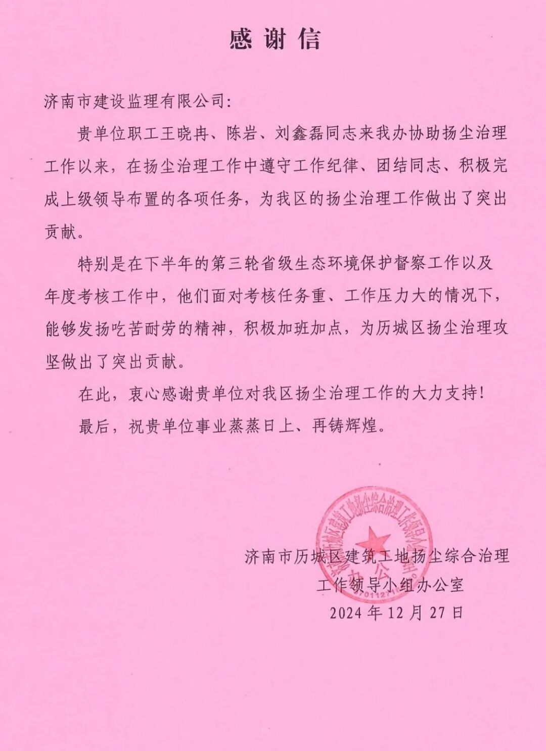 近日,我公司歷城區(qū)住建局第三方巡檢項(xiàng)目收到了來自歷城區(qū)建筑工地?fù)P塵綜合治理工作領(lǐng)導(dǎo)小組辦公室表?yè)P(yáng)信,信中對(duì)我公司項(xiàng)目工作人員的業(yè)務(wù)水平、責(zé)任心、組織協(xié)調(diào)能力給予充分肯定。
