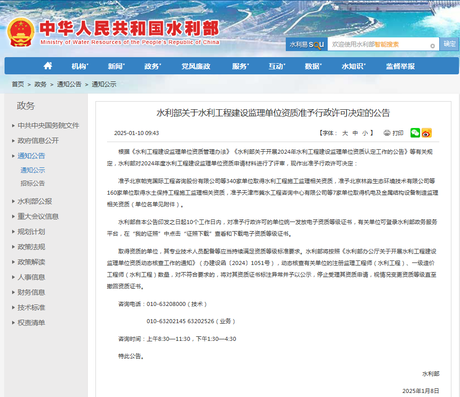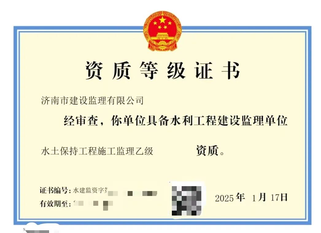 二〇二五年一月,經(jīng)水利部批準(zhǔn),我公司同時取得水利工程施工監(jiān)理乙級資質(zhì)及水土保持工程施工監(jiān)理乙級資質(zhì)。這是我公司在取得工程監(jiān)理綜合資質(zhì)后,又獲得的住建部管理范疇之外的從業(yè)資格,為公司經(jīng)營業(yè)務(wù)開辟新的領(lǐng)域,為公司業(yè)務(wù)類型的拓展提供新的平臺,也為公司持續(xù)、快速發(fā)展奠定了堅實基礎(chǔ)。